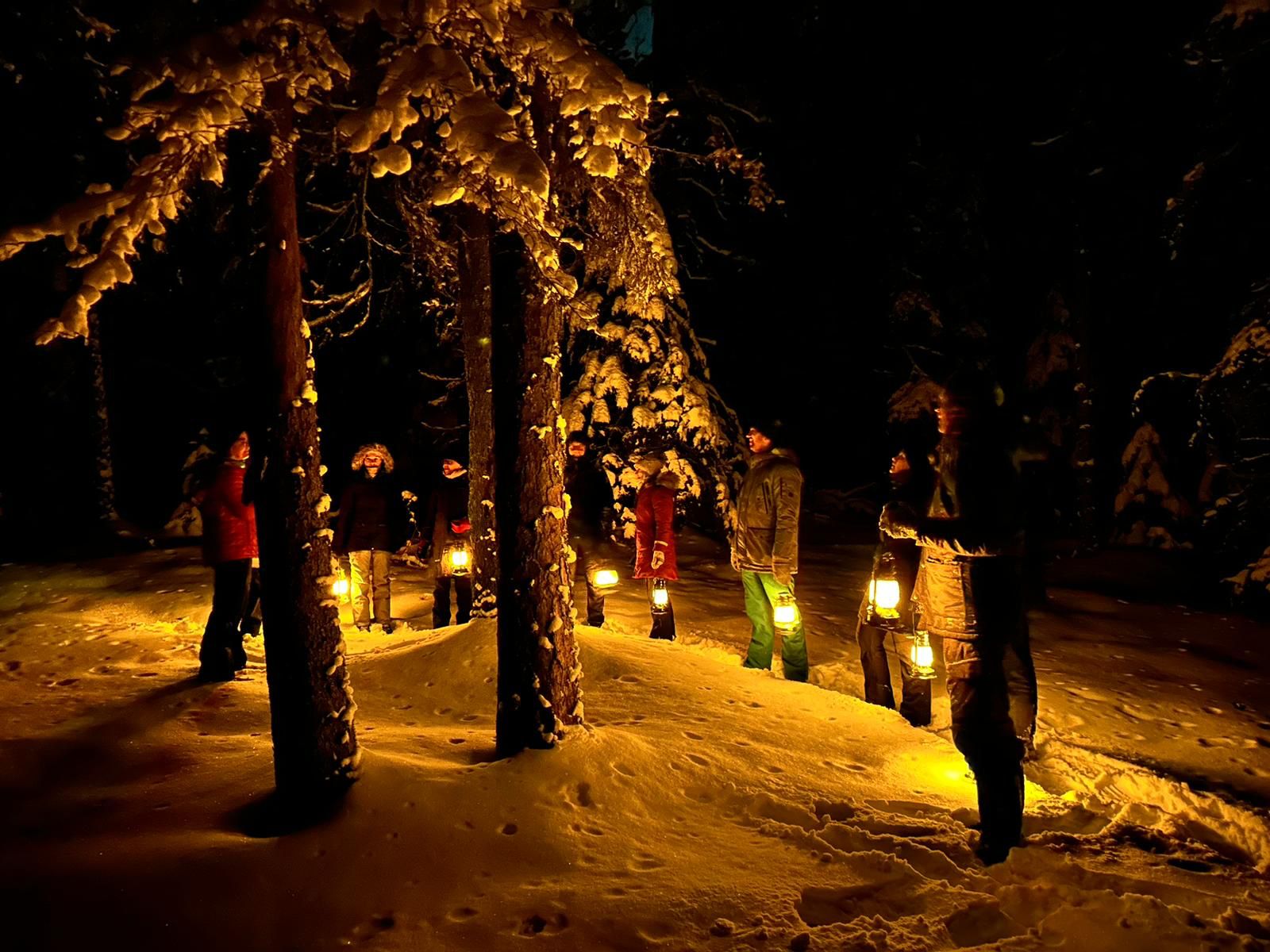 An evening hike through the snowy forest by lantern light feels like stepping into an enchanted woodland. In the soft glow, each tree becomes a sculpture, adorned by the twinkling stars above. We listen to the silence, our own breath, and the gentle crunch of snow beneath our feet.